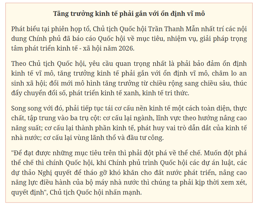 Chính vì vậy, một số đại biểu Quốc hội bày tỏ băn khoăn về mục tiêu này và cho rằng, dư địa tăng trưởng năm 2026 không còn nhiều. Bởi, tốc độ tăng năng suất lao động năm 2025 mới đạt 6,85%, tăng trưởng GDP 8%, nên để đạt mục tiêu 10% trong năm 2026 là “rất khó khăn”. Đại biểu Trần Văn Tiến (Phú Thọ) đề nghị Chính phủ cần “làm rõ hơn các kịch bản tăng trưởng, xác định cụ thể dư địa phát triển từng khu vực, từng ngành” để bảo đảm tính khả thi.