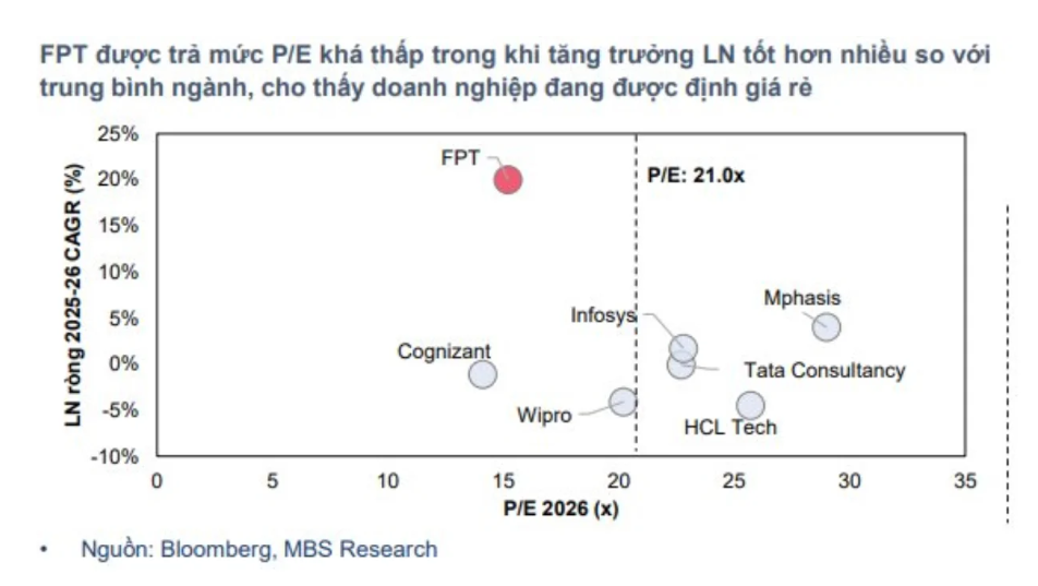Mặt khác, MBS cho rằng Nghị quyết 57 là một cú hích toàn diện, mở đường cho ngành CNTT và doanh nghiệp công nghệ trong nước. Nhóm phân tích dự báo doanh thu mảng công nghệ tăng trưởng kép 25% giai đoạn 2025-2027 nhờ chi tiêu CNTT toàn cầu tiếp tục tăng, đặc biệt mảng chuyển đổi số duy trì CAGR 16,2% giai đoạn 2025-27. Chiến lược đa dạng hóa thị trường sang EU, Trung Đông thông qua M&A giúp tiếp cận nhiều hợp đồng quy mô lớn. Hai nhà máy AI cũng được dự báo đóng góp ~1.250 tỷ đồng (~2,2% doanh thu mảng) từ 2026 và tăng trưởng 30-50% các năm sau.