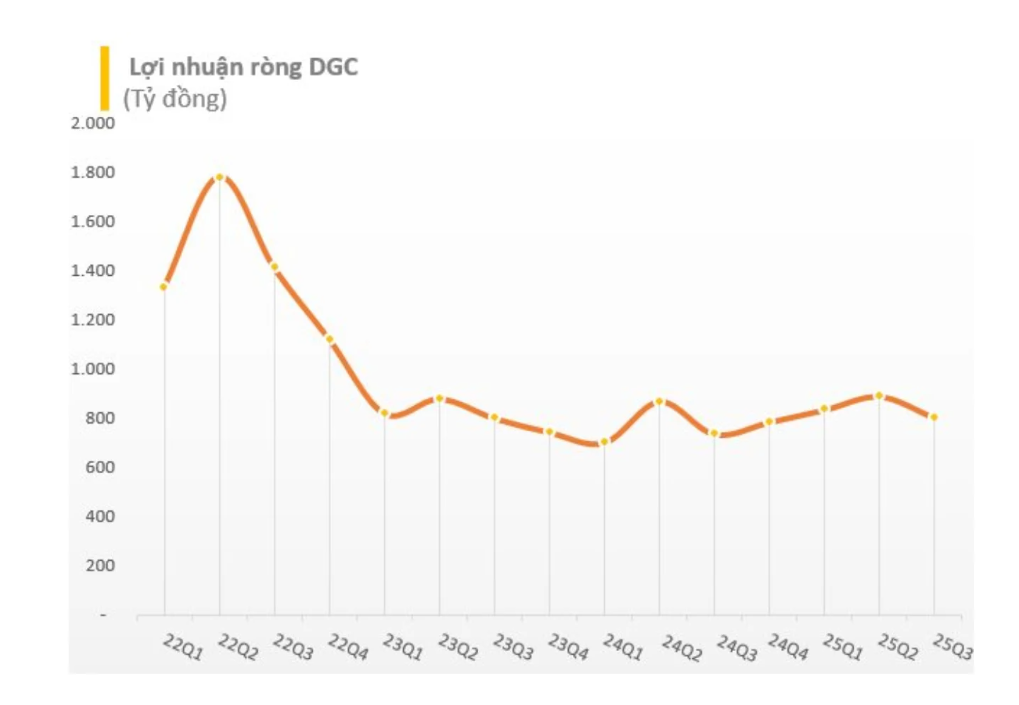 Cũng ghi nhận tăng trưởng trong quý 3/2025, Hóa chất Đức Giang ghi nhận doanh thu thuần gần 2.817 tỷ đồng, tăng 10,1% so với cùng kỳ năm trước. Lợi nhuận sau thuế đạt hơn 804 tỷ đồng, tăng 9%. Lũy kế 9 tháng đầu năm, doanh thu thuần của DGC đạt hơn 8.521 tỷ đồng, tăng 14,4%, trong khi lợi nhuận sau thuế đạt hơn 2.532 tỷ đồng, tăng 9%. Với kết quả này, doanh nghiệp đã hoàn thành khoảng 84,4% mục tiêu lợi nhuận sau thuế 3.000 tỷ đồng cho cả năm 2025.