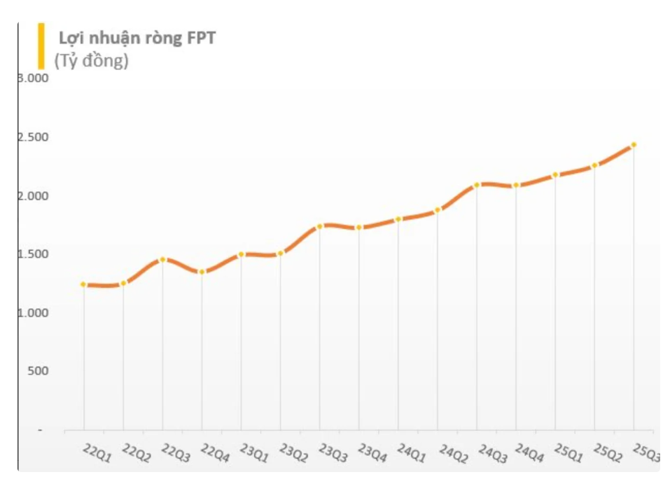 FPT vẫn duy trì lợi nhuận tăng trưởng khá đều đặn (17%-20%), song việc tăng doanh thu có phần chậm lại do triển vọng chi tiêu công nghệ toàn cầu yêu đi. Lũy kế 11 tháng đầu năm, doanh thu của Tập đoàn ước đạt 62.200 tỷ đồng, tăng 10,3% so với cùng kỳ 2024. Lợi nhuận trước thuế đạt hơn 12.000 tỷ đồng, tăng 17,2% so với cùng kỳ năm ngoái. Riêng trong quý 3/2025, LNTT của FPT đạt xấp xỉ 3.400 tỷ đồng, tăng trưởng 16% so với cùng kỳ năm trước.