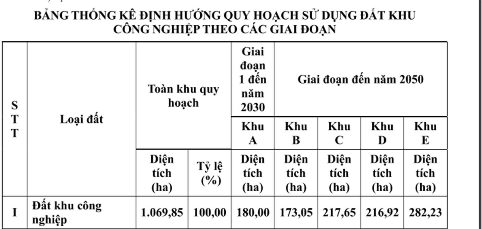 Quy hoạch khu công nghiệp này được chia làm nhiều giai đoạn, trong đó giai đoạn 1 triển khai 180 ha, tập trung vào thu hút các nhà đầu tư tiên phong, phát triển hạ tầng và tạo tiền đề cho các giai đoạn tiếp theo.