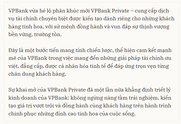 Tạp chí Asian Banking & Finance ghi nhận: “VPBank giành chiến thắng ở hạng mục ‘Dịch vụ ngân hàng ưu tiên xuất sắc nhất Việt Nam’ là minh chứng rõ nét cho thành công của ngân hàng trong chuyển đổi số và cá nhân hóa. Hướng đến nhóm khách hàng giàu có và có giá trị tài sản ròng cao (HNWI), VPBank Diamond đã tích hợp tài chính, công nghệ và phong cách sống vào một hệ sinh thái thịnh vượng cao cấp”.