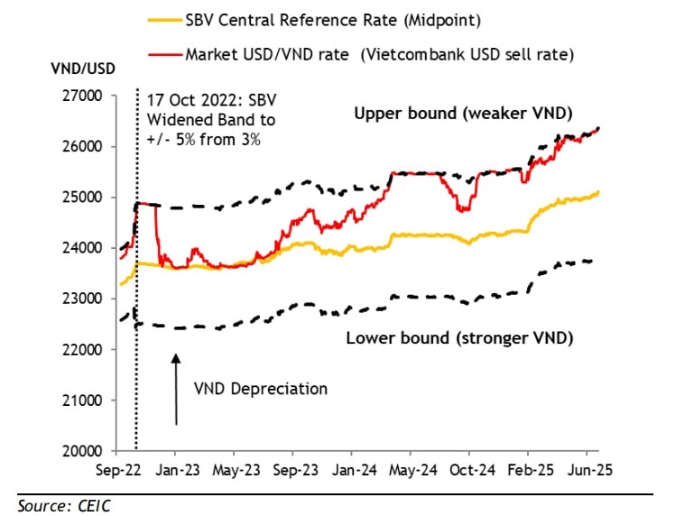 Ngân hàng Nhà nước được chỉ đạo hỗ trợ tăng trưởng tín dụng, và đã duy trì các lãi suất điều hành thấp trong nửa đầu năm 2025. Chúng tôi cho rằng nhà điều hành vẫn có thể hạ lãi suất chính sách 25 điểm cơ bản trong quý III khi Cục Dự trữ Liên bang Mỹ bắt đầu nới lỏng, giảm áp lực lên tỷ giá. Tín dụng đã tăng mạnh từ +12,4% đầu năm lên +18,9% trong tháng 6 (tương đương +6,5% theo ước tính sơ bộ; tuy nhiên theo số liệu từ NHNN công bố, con số này đã +9,9%).