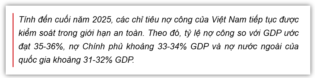 Về nợ công, năm 2024, tỷ lệ nợ công trên GDP của Việt Nam ước đạt 34%, thấp hơn nhiều so với giới hạn 60% do Quốc hội cho phép. Nợ Chính phủ chiếm khoảng 31,8% GDP, nghĩa vụ trả nợ nước ngoài chỉ 7,8% tổng kim ngạch xuất khẩu hàng hóa và dịch vụ. Ngoài ra, hiện nay, phần lớn nợ công của Việt Nam hiện nay là nợ trong nước, chiếm tới 76%. Việc chuyển dịch cơ cấu nợ theo hướng nội tệ hóa giúp giảm rủi ro tỷ giá và phụ thuộc vào vốn vay nước ngoài.
