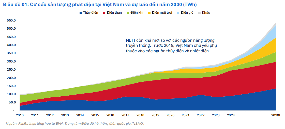 FiinRatings nhận định, sản lượng điện tiêu thụ tại Việt Nam sẽ duy trì tốc độ tăng khoảng 7% mỗi năm trong trung hạn, nhờ sự mở rộng của công nghiệp chế biến - chế tạo, quá trình đô thị hóa và hội nhập sâu vào chuỗi cung ứng toàn cầu. Xu hướng này cho thấy tính cấp thiết của việc đa dạng hóa nguồn phát điện, giảm phụ thuộc vào thủy điện và nhiệt điện than - vốn đang đối diện với nhiều thách thức về môi trường.