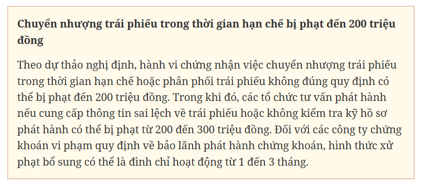 Bên cạnh đó, các hành vi lập, xác nhận hồ sơ đăng ký chào bán, phát hành cổ phiếu, trái phiếu chuyển đổi, trái phiếu kèm chứng quyền riêng lẻ có thông tin sai lệch, sai sự thật hoặc che giấu sự thật có thể bị phạt từ 500 đến 600 triệu đồng. Nếu doanh nghiệp thay đổi điều khoản của trái phiếu đã phát hành không đúng quy định, mức phạt có thể lên đến 400 triệu đồng.