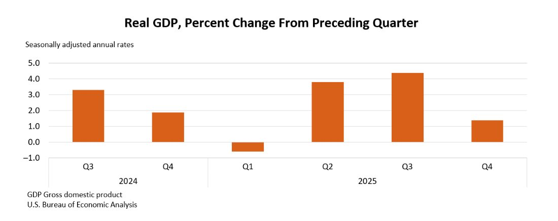 Tăng trưởng kinh tế Mỹ vào cuối năm 2025 chậm hơn dự kiến vì việc Chính phủ đóng cửa ảnh hưởng đến chi tiêu và đầu tư. Cụ thể, Bộ Thương mại Mỹ cho biết tổng sản phẩm quốc nội (GDP) quý 4/2025 tăng 1,4% so với cùng kỳ năm ngoái. Mức này thấp hơn nhiều so với dự báo tăng 2,5% của Dow Jones.