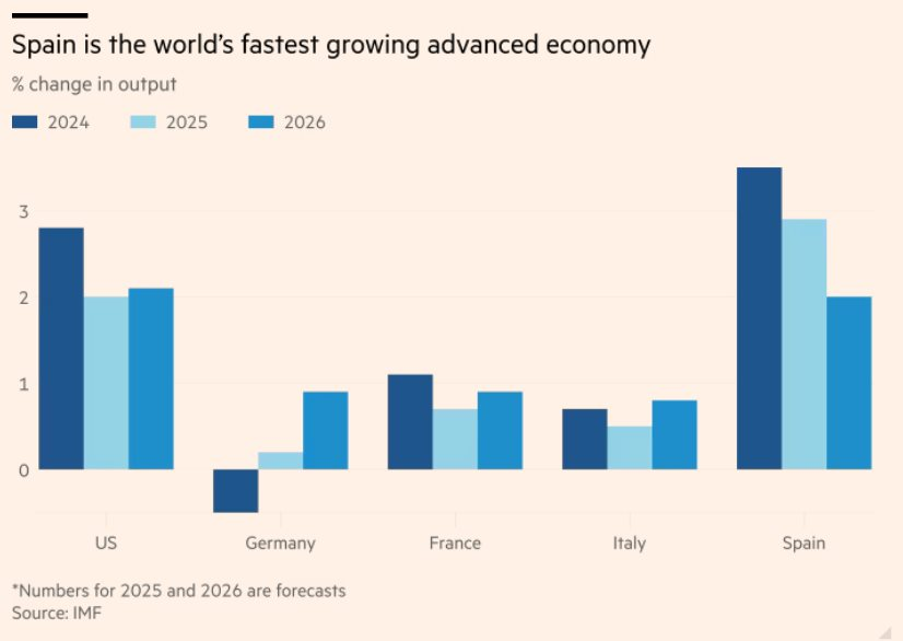 Theo IMF, Tây Ban Nha là nền kinh tế phát triển có tốc độ tăng trưởng nhanh nhất thế giới năm 2024. Tốc độ tăng GDP bình quân hàng quý đạt 3,9% từ đầu năm 2022, trong khi Đức chỉ đạt 0,3%. IMF dự báo tăng trưởng của Tây Ban Nha đạt 2% trong năm 2026, chỉ thấp hơn một chút so với mức dự kiến 2,1% của Mỹ.