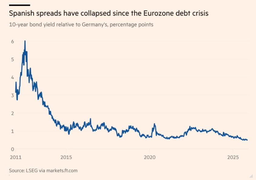 Tây Ban Nha hưởng lợi khi nhu cầu trái phiếu tăng mạnh. Lợi suất trái phiếu kỳ hạn 10 năm so với trái phiếu Đức đã thu hẹp về khoảng 0,5 điểm phần trăm. Đây là mức thấp nhất kể từ trước khủng hoảng nợ, khi khoảng chênh từng vượt 6 điểm phần trăm.