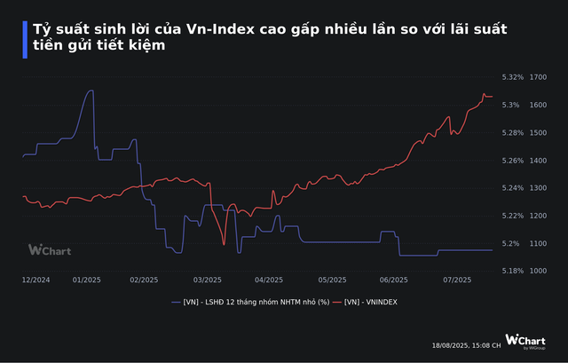 Trong khi đó, lãi suất gửi tiết kiệm ngân hàng lại ở mức thấp kỷ lục. Trên thị trường, lãi suất kỳ hạn 12 tháng tại các ngân hàng thương mại phổ biến chỉ dao động từ 5-6%/năm; thậm chí tại nhóm ngân hàng thương mại Nhà nước, lãi suất huy động cao nhất chỉ còn 4,7 – 4,8%/năm. Với lạm phát duy trì quanh mức 4%, lợi nhuận thực tế từ gửi tiết kiệm gần như không đáng kể, khiến nhiều người cảm thấy "hụt hẫng" khi so sánh với tiềm năng sinh lời từ chứng khoán.