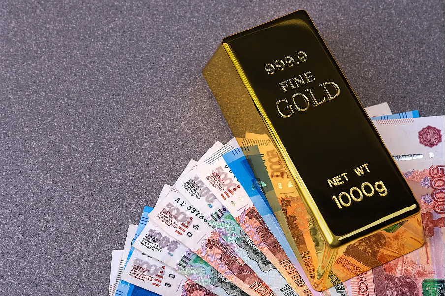 Hình minh họa thỏi vàng đặt trên đồng Rúp Nga. Ảnh: Getty