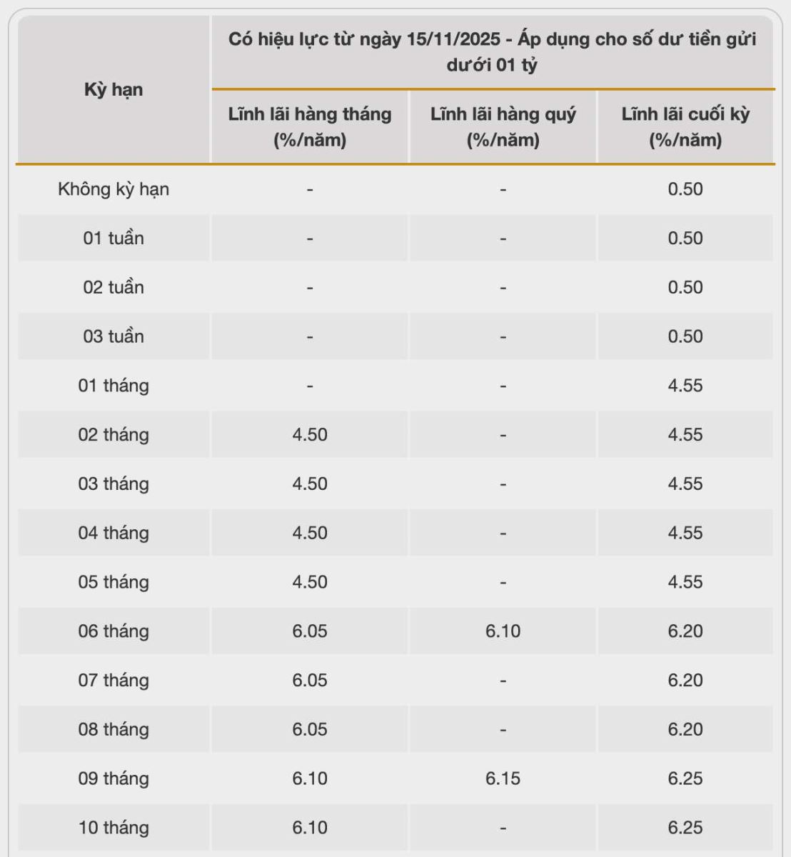 Theo khảo sát của PV Báo Lao Động ngày 2.12.2025, lãi suất tiết kiệm kỳ hạn 13 tháng trong hệ thống ngân hàng dao động quanh ngưỡng 4,4 - 9%.