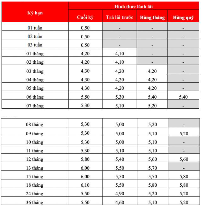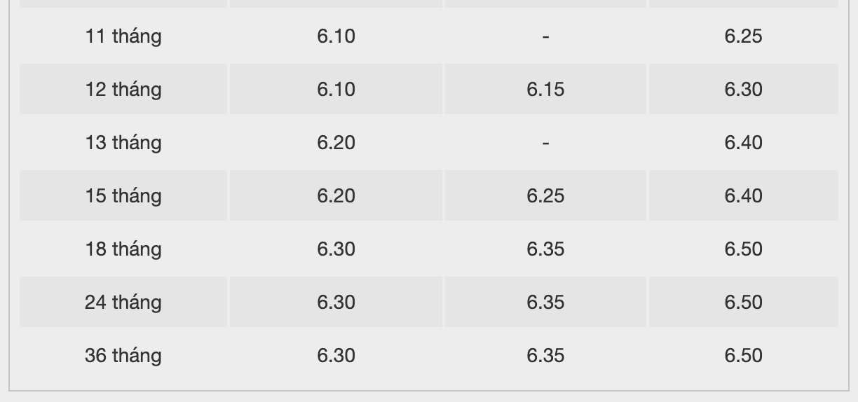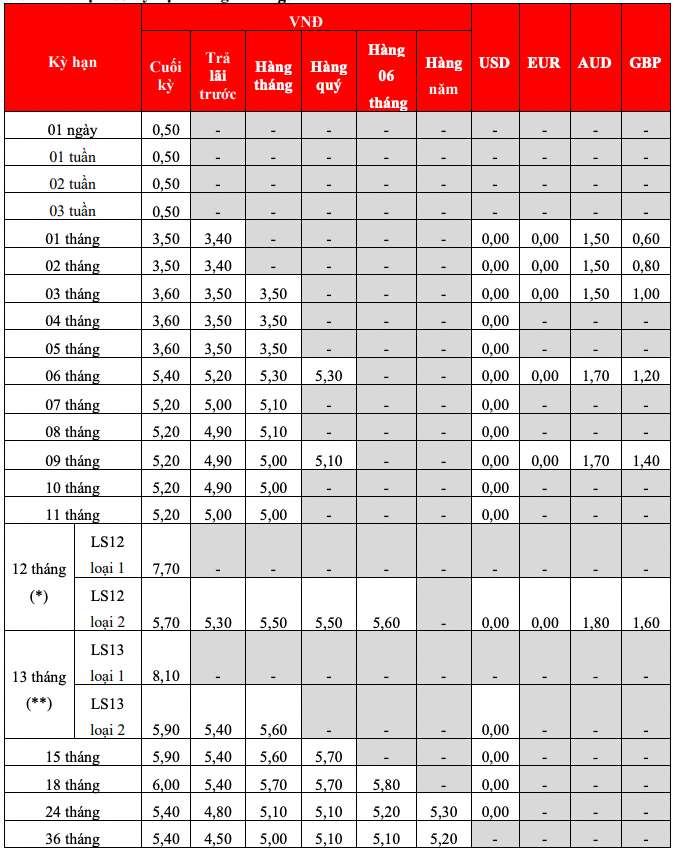 * Thông tin về lãi suất chỉ mang tính chất tham khảo và có thể thay đổi trong từng thời kì. Vui lòng liên hệ điểm giao dịch ngân hàng gần nhất hoặc hotline để được tư vấn.