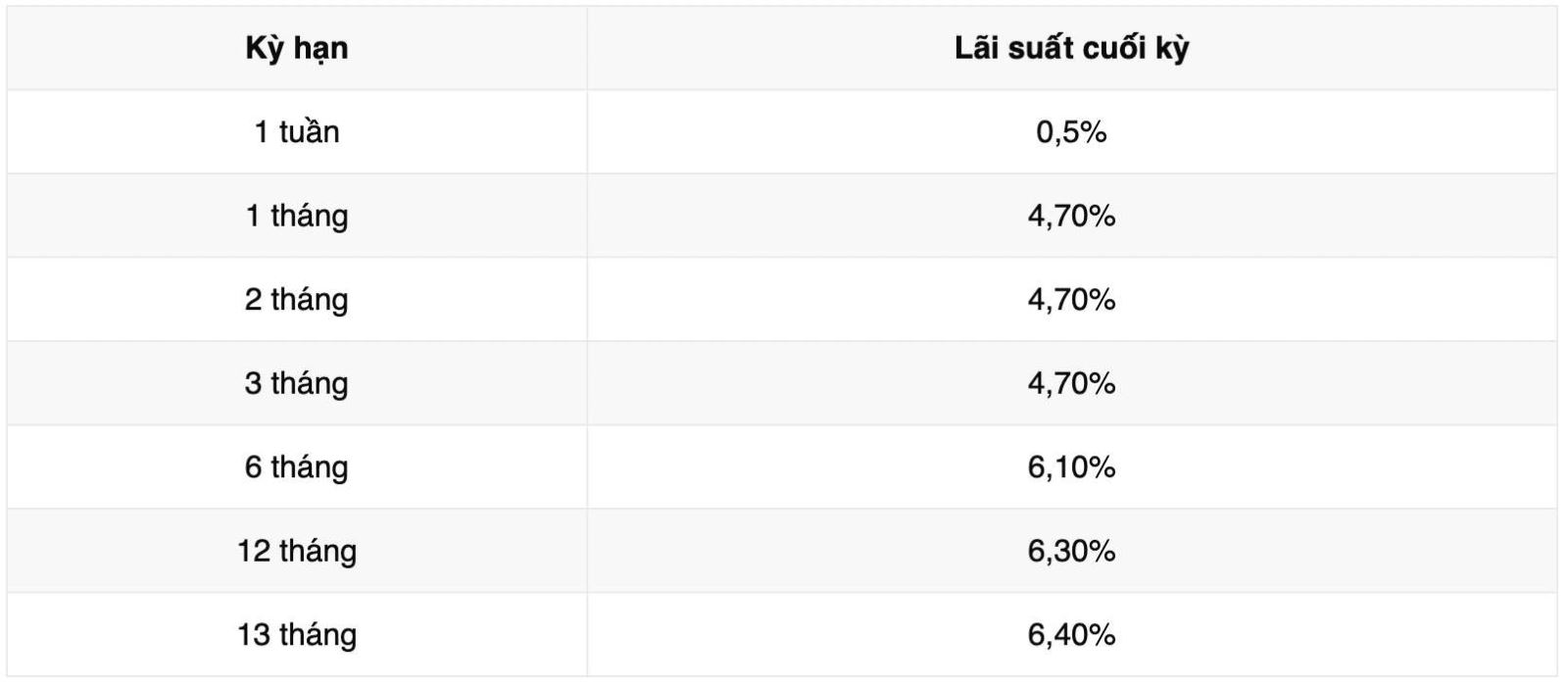 Vikki Bank đang niêm yết lãi suất cao nhất kỳ hạn 13 tháng ở mức 6,4%/năm khi khách hàng gửi tiền online, lĩnh lãi cuối kỳ. Ở những kỳ hạn khác, khách hàng niêm yết lãi suất ở mức 0,5-6,4%/năm.