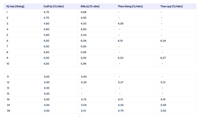 Cake by VPBank đang niêm yết lãi suất tiết kiệm 13 tháng cao nhất ở mức 6,5% khi khách hàng gửi tiền online, lĩnh lãi cuối kỳ. Đây cũng là mức lãi suất ngân hàng này đang niêm yết cao nhất, được áp dụng từ kỳ hạn 6 - 36 tháng.