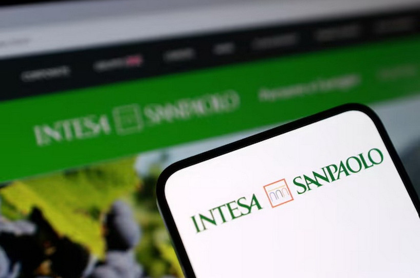 Logo của Ngân hàng Intesa Sanpaolo trên điện thoại. (Nguồn: Reuters)