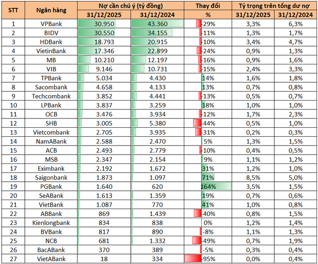 Xét về quy mô tuyệt đối, VPBank là ngân hàng có nợ cần chú ý lớn nhất hệ thống, đạt 30.950 tỷ đồng tại thời điểm 31/12/2025. Tuy nhiên, con số này đã giảm mạnh 29% so với mức 43.360 tỷ đồng cuối năm 2024, tương đương giảm hơn 12.400 tỷ đồng. Tỷ trọng nợ cần chú ý trên tổng dư nợ của ngân hàng này cũng giảm mạnh từ 6,3% xuống còn 3,3%, cho thấy áp lực chất lượng tín dụng đã phần nào được cải thiện sau giai đoạn tăng cao trước đó.
