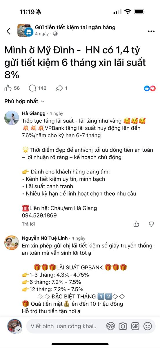 Ở chiều ngược lại, các khách hàng chỉ cần đăng thông tin muốn gửi tiết kiệm ở đâu lãi suất tốt thì hàng trăm bình luận các nhân viên ngân hàng công khai tên ngân hàng, lãi suất hấp dẫn lên tới hơn 8%/năm.