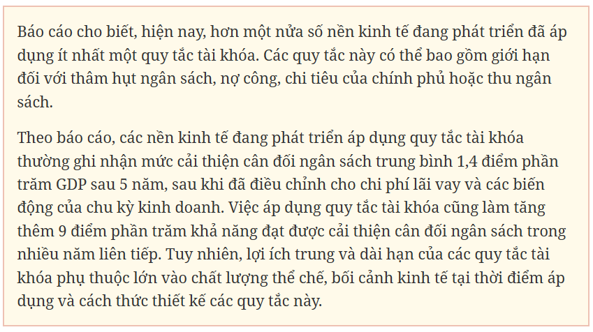 Theo ông M. Ayhan Kose - Chuyên gia Phó Kinh tế trưởng và Giám đốc Nhóm Triển vọng của Nhóm Ngân hàng Thế giới: “Trong bối cảnh nợ công tại các nền kinh tế mới nổi và đang phát triển đã lên mức cao nhất trong hơn nửa thế kỷ, việc khôi phục uy tín tài khóa đã trở thành một ưu tiên cấp bách. Các quy tắc tài khóa được thiết kế tốt có thể giúp các chính phủ ổn định nợ, tái tạo các ‘vùng đệm’ chính sách và ứng phó hiệu quả hơn với các cú sốc. Tuy nhiên, chỉ riêng các quy tắc là chưa đủ: uy tín, việc thực thi và cam kết chính trị mới là những yếu tố quyết định liệu các quy tắc tài khóa có mang lại ổn định và tăng trưởng hay không”.