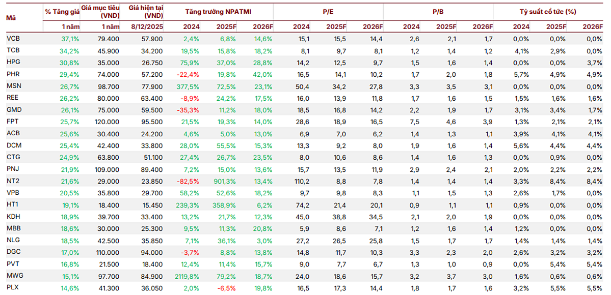Danh mục cổ phiếu ưa thích mà SSI đưa ra bao gồm nhiều đại diện nổi bật từ các nhóm ngành kể trên. Một số mã đáng chú ý như VCB, TCB, HPG, FPT, ACB, DCM, CTG, PNJ, VPB, MBB, DGC, MWG - đều sở hữu mức tăng trưởng lợi nhuận dự phóng tốt, định giá hợp lý và tiềm năng tăng giá từ 15-37% tùy doanh nghiệp.