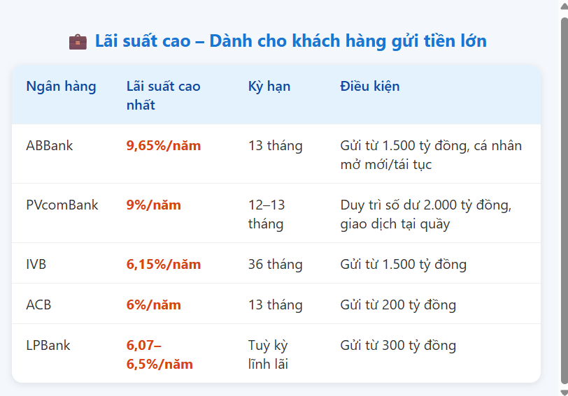 ABBank hiện công bố mức lãi suất 9,65%/năm, áp dụng cho khách hàng cá nhân gửi từ 1.500 tỷ đồng, kỳ hạn 13 tháng. PVcomBank đưa ra lãi suất 9%/năm cho kỳ hạn 12–13 tháng, với điều kiện khách hàng duy trì số dư tối thiểu 2.000 tỷ đồng và giao dịch tại quầy.