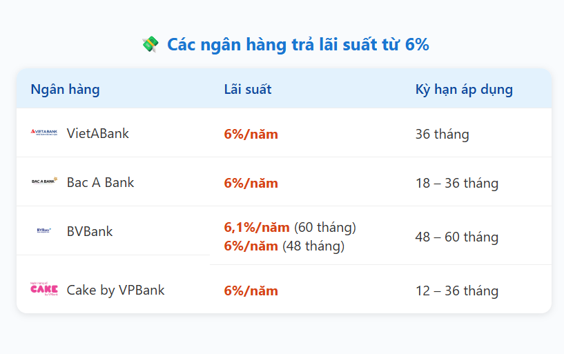 Cụ thể, VietABank áp dụng mức 6%/năm cho kỳ hạn 36 tháng; Bac A Bank duy trì mức tương tự cho các kỳ hạn từ 18 đến 36 tháng. BVBank niêm yết lãi suất 6,1%/năm cho kỳ hạn 60 tháng và 6%/năm cho kỳ hạn 48 tháng. Cake by VPBank áp dụng mức 6%/năm cho các khoản gửi từ 12 đến 36 tháng.