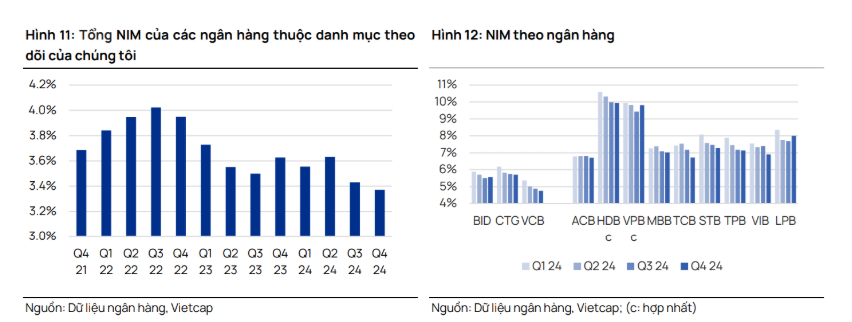 Theo công ty chứng khoán Mirae Asset Việt Nam (MASVN), NIM của các ngân hàng đã bắt đầu sụt giảm từ quý IV/2024 và dự kiến sẽ tiếp tục đối mặt với nhiều áp lực trong năm 2025.