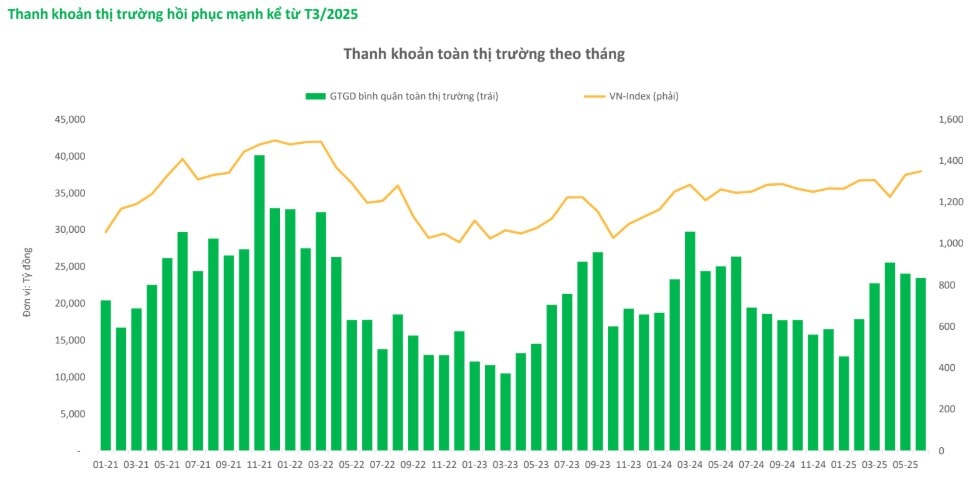 VPBankS dự báo tổng lợi nhuận sau thuế quý II/2025 của công ty chứng khoán niêm yết là 3.657 tỷ đồng, tăng trưởng 45% so với cùng kỳ năm 2024. Nếu VN-Index tiếp tục có biến động như dự báo ở phiên trước, tăng trưởng lợi nhuận quý III của ngành chứng khoán có thể mạnh hơn nữa.