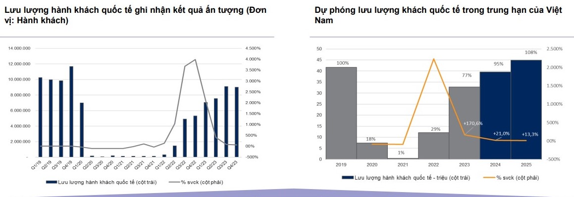 VNDirect kỳ vọng, Trung Quốc sẽ là động lực chính cho sự phục hồi lượng khách quốc tế trong năm 2024. Số lượng hành khách Trung Quốc đến Việt Nam đã phục hồi mạnh từ quý III/2023 và kỳ vọng đạt 80% mức trước đại dịch vào cuối năm 2024, phục hồi hoàn toàn vào cuối năm 2025.