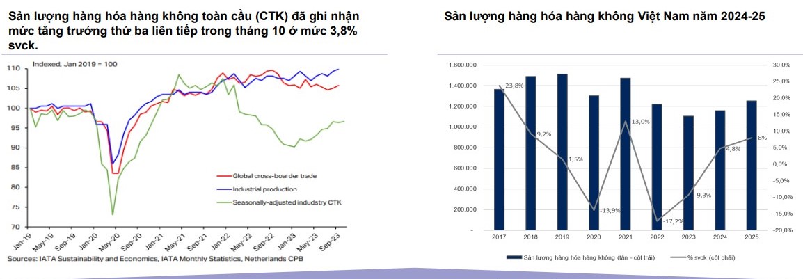“Chúng tôi kỳ vọng sản lượng hàng hóa hàng không của Việt Nam đạt tốc độ tăng trưởng kép (CAGR) là 6,4% trong giai đoạn 2024-2025 nhờ thương mại toàn cầu tăng trưởng trở lại sau giai đoạn kinh tế vĩ mô toàn cầu suy yếu trong năm 2023”, VNDirect đánh giá.