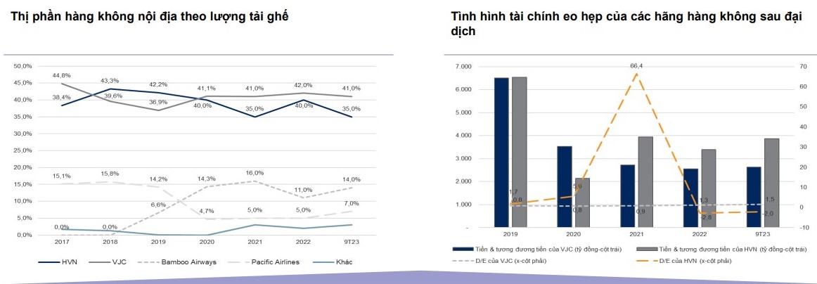 Thị phần của HVN giảm từ 40% năm 2022 xuống 35% trong 9 tháng năm 2023 do đội tàu không được mở rộng. Sau giai đoạn tăng trưởng mạnh, thị phần của Bamboo Airways bắt đầu giảm từ mức 16% năm 2021 xuống 14% trong 9 tháng năm 2023 do những thay đổi trong ban lãnh đạo và chính sách thu hẹp mạng đường bay và đội bay trong thời kỳ tái cơ cấu. VJC lấy lại thị phần và duy trì vị trí dẫn đầu kể từ năm 2020 và có vị thế tốt để đón đầu sự phục hồi của ngành.