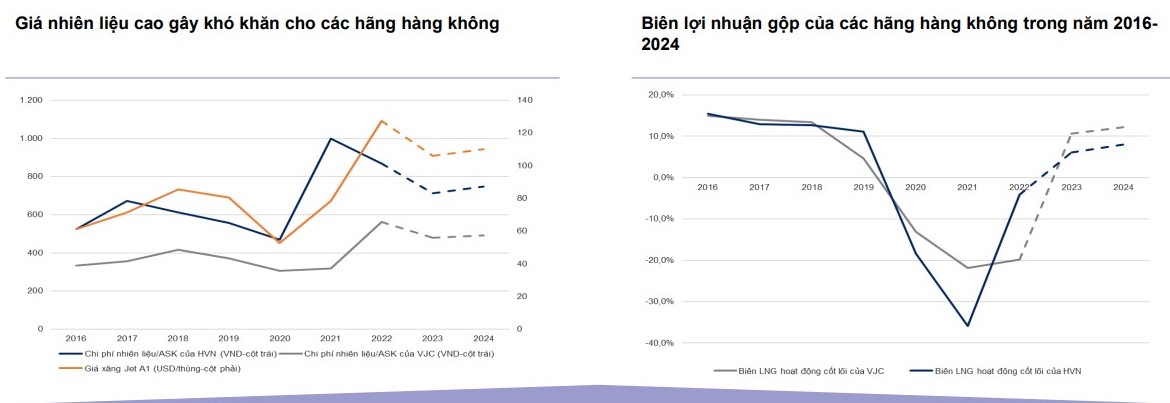 “Trước tình hình giá nhiên liệu máy bay giữ ở mức cao, chúng tôi tin rằng VJC sẽ ít bị ảnh hưởng hơn so với HVN nhờ đội bay trẻ hơn cùng với việc đang dần thay thế máy bay cũ bằng loại máy bay mới A321NEO, tiết kiệm nhiên liệu hơn 20% so với đội bay hiện tại. Chúng tôi dự báo biên lợi nhuận gộp của VJC ở mức 12% trong khi biên lợi nhuận gộp của HVN thấp hơn đạt khoảng 8% trong năm 2024”, VNDirect nhận định.