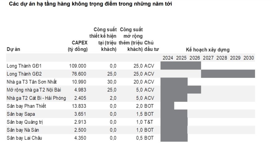 Nhà ga T3 Tân Sơn Nhất và sân bay quốc tế Long Thành giai đoạn 1 đang được triển khai xây dựng và dự kiến hoàn thành lần lượt vào năm 2025/2026. Dự án mở rộng nhà ga T2 Nội Bài dự kiến được khởi công xây dựng trong năm 2024 và hoàn thành vào năm 2026. Các dự án trọng điểm này sẽ giúp tăng công suất khai thác và giảm ùn tắc tại hai sân bay chính của Việt Nam.