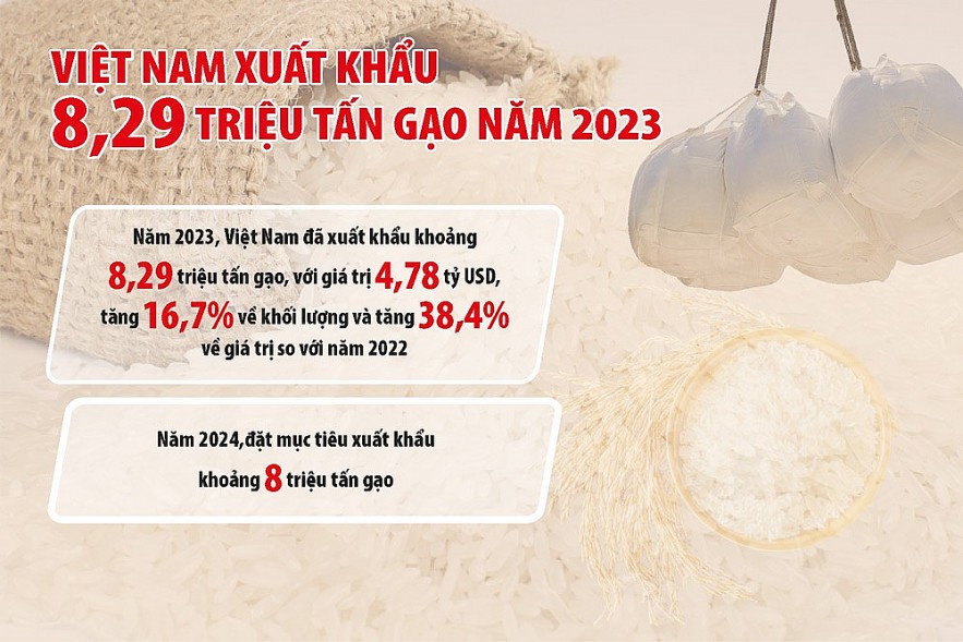 Số liệu từ Bộ Nông nghiệp và Phát triển nông thôn (NN&PTNT) cho thấy, khép lại năm 2023, Việt Nam đã xuất khẩu (XK) khoảng 8,29 triệu tấn gạo, đem về giá trị 4,78 tỷ USD, tăng 16,7% về khối lượng và tăng 38,4% về giá trị so với năm 2022. Đây là con số cao kỷ lục trong hơn 30 năm tham gia XK gạo.