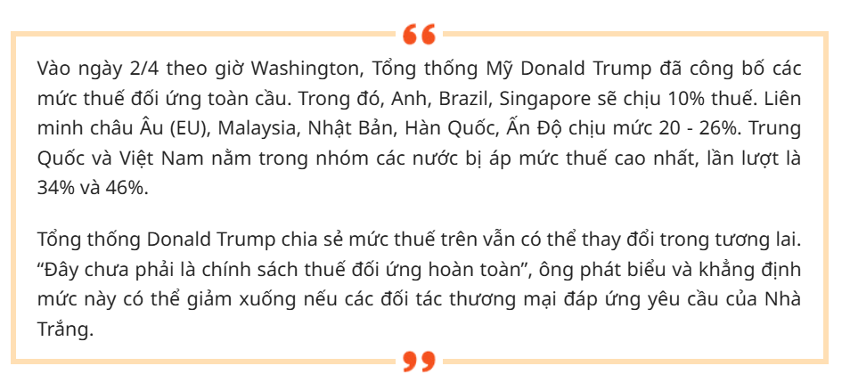 Ngày 3/4, chia sẻ với phóng viên bền lề Hội nghị Phòng chống dịch bệnh và phát triển chăn nuôi lợn, về việc Mỹ công bố áp mức thuế đối ứng 46% lên Việt Nam, Thứ trưởng Bộ Nông nghiệp và Môi trường Phùng Đức Tiến cho rằng: "Nông sản Việt Nam chịu ảnh hưởng trực tiếp từ quyết định tăng thuế của Mỹ nhưng chúng ta sẽ phải dĩ bất biến, ứng vạn biến". Theo Thứ trưởng, từ trước đó, Việt Nam khi xuất khẩu nông sản vào thị trường Mỹ đã phải đối mặt với nhiều rào cản, thách thức như chống bán phá giá nhưng các doanh nghiệp đều vượt qua.