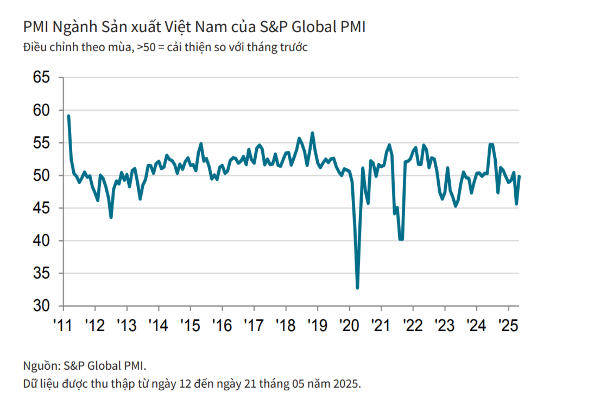 Chỉ số Nhà quản trị mua hàng (PMI) của ngành sản xuất Việt Nam tháng 5/2025, theo S&P Global, đạt 49,8 điểm, tăng nhẹ so với 45,6 điểm của tháng 4, nhưng vẫn nằm dưới ngưỡng 50 điểm, ranh giới phân định giữa mở rộng và thu hẹp hoạt động. Con số này chứng tỏ bức tranh sản xuất đang trên đà phục hồi, song vẫn còn ở ngưỡng dè dặt, khi điều kiện kinh doanh hầu như không thay đổi so với tháng trước.