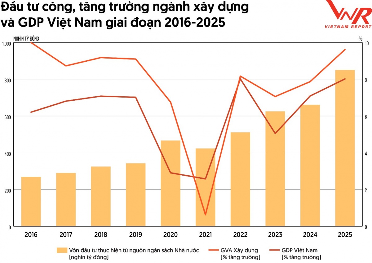 Không dừng lại ở đó, ngành xây dựng còn đóng vai trò quan trọng trong tăng trưởng kinh tế vĩ mô. Trong 9/10 năm qua, tốc độ tăng trưởng của ngành luôn cao hơn tốc độ tăng trưởng GDP (ngoại trừ năm 2021 do ảnh hưởng của đại dịch). Năm 2025, giá trị tăng thêm của ngành xây dựng đạt 9,62%, vượt mức tăng trưởng GDP 8,02%, khẳng định vai trò “đầu tàu” của ngành trong nền kinh tế.