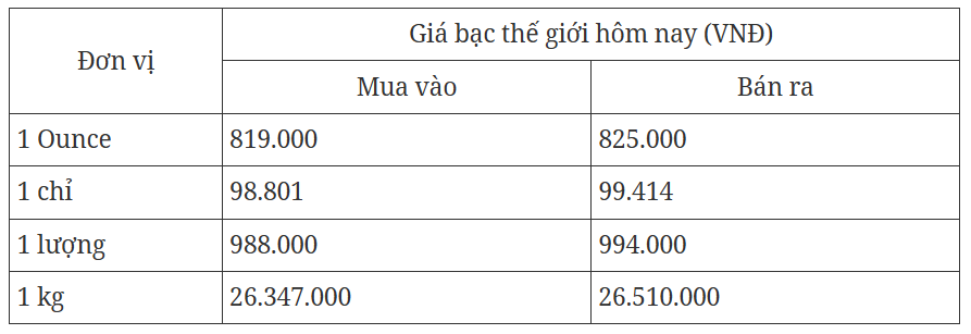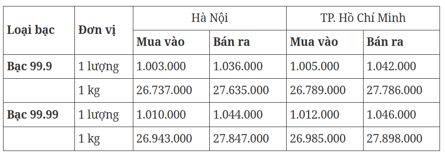 Tại TP. Hồ Chí Minh, giá bạc hiện ở mức 1.005.000 đồng/lượng (mua vào) và 1.042.000 đồng/lượng (bán ra), tăng 8.000 đồng/lượng cả chiều mua vào và bán ra so với phiên trước.