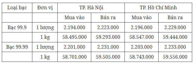 Tại TP. Hồ Chí Minh giá bạc hiện ở mức 2.196.000 đồng/lượng (mua vào) và 2.229.000 đồng/lượng (bán ra).