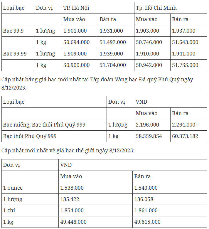 Thông tin mới nhất về giá bạc tại Nội và TP. Hồ Chí Minh sáng 8/12/2025