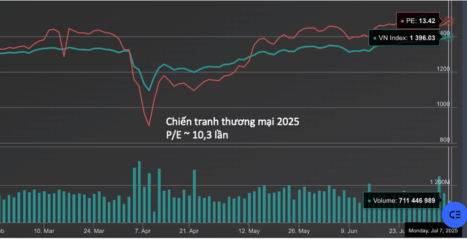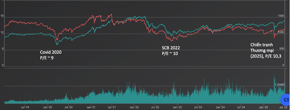 P/E lúc đó chạm vùng 10, tức là thị trường đang rẻ hơn cả thời điểm nhiều khủng hoảng trước.