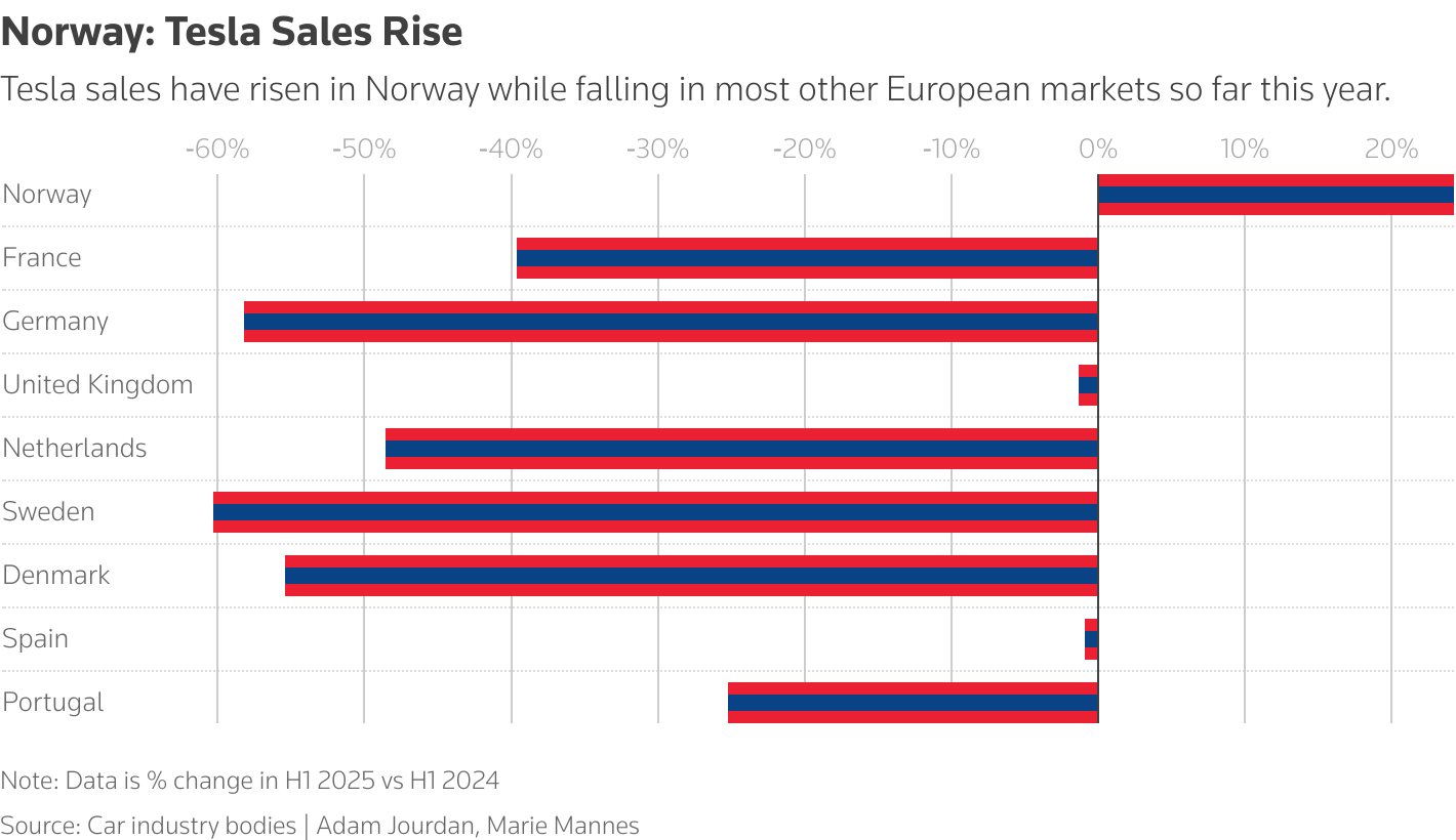 Trong nửa đầu năm 2025, khi doanh số Tesla sụt giảm hơn 50% tại Đức, Thụy Điển, Đan Mạch và Hà Lan, thị trường Na Uy lại tăng 24% so với cùng kỳ. Sự tăng trưởng này đưa Na Uy với 5,5 triệu dân trở thành thị trường lớn thứ 2 của Tesla ở châu Âu.