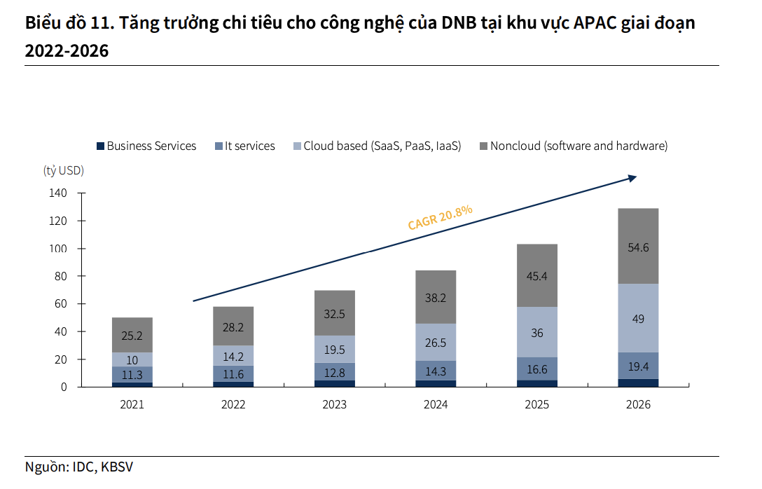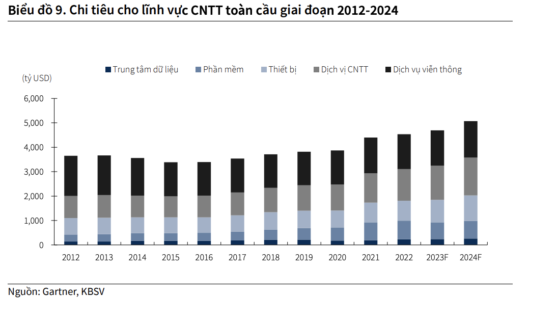 Về dài hạn, KBSV cho rằng chi tiêu cho lĩnh vực công nghệ thông tin sẽ tiếp tục tăng trưởng do sự phát triển nhanh của công nghệ, đòi hỏi các doanh nghiệp, tổ chức phải mạnh tay đầu tư để cạnh tranh, thích nghi với xu thế tất yếu; thói quen của người tiêu dùng dần thay đổi, phụ thuộc vào các sản phẩm công nghệ thông tin; Chính phủ các nước ưu tiên phát triển công nghệ để bắt kịp sự thay đổi của thế giới.
