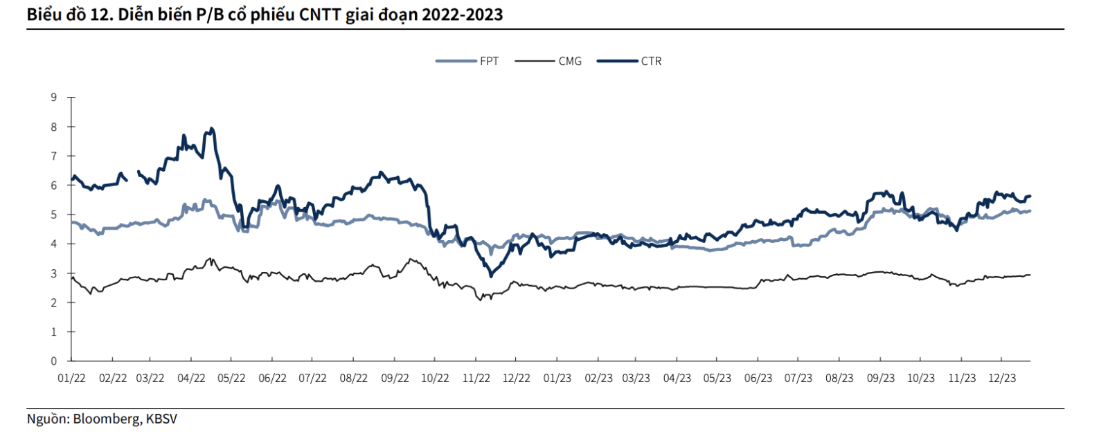 Trong khi đó, KBSV cho rằng thị trường Mỹ và EU sẽ phục hồi về nhu cầu chi tiêu cho lĩnh vực công nghệ thông tin. Làn sóng sa thải nhân sự công nghệ thông tin đã kết thúc tại Mỹ và kỳ vọng lãi suất sẽ hạ nhiệt trong năm 2024. Bên cạnh đó, theo dự báo của Gartner, chi tiêu cho lĩnh vực công nghệ thông tin cho EU sẽ đạt tăng trưởng 9,3% trong 2024, phục hồi từ mức thấp trong năm 2023 (5,3%).
