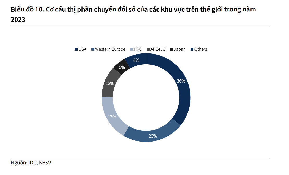 KBSV lưu ý rằng Mỹ và EU vẫn là khu vực đứng đầu thế giới trong đầu tư cho công nghệ thông tin. Theo đánh giá của IDC (công ty nghiên cứu thị trường và tư vấn công nghệ tại Mỹ), chi tiêu cho chuyển đổi số tại EU sẽ tăng trưởng nhanh với mức CAGR 16% cho giai đoạn 2023-2027.