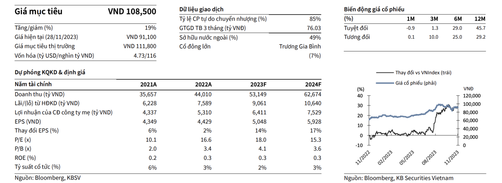 Sang năm 2024, các chuyên gia của KBSV cũng khuyến nghị mua cổ phiếu FPT với giá mục tiêu là 108.500 đồng/cổ phiếu, cao hơn 19% so với giá tại ngày 28/11/2023 nhờ kết quả kinh doanh tích cực trong quý 3/2023.