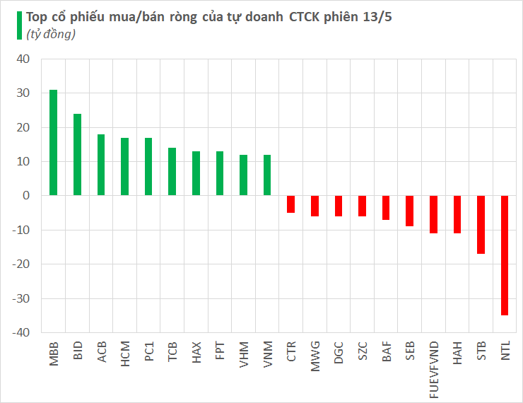 Cụ thể, giao dịch của các CTCK mua ròng mạnh nhất tại mã MBB với 31 tỷ, hai mã BID và ACB được mua ròng với lần lượt 24 tỷ và 18 tỷ. Cổ phiếu HCM cũng được mua ròng 17 tỷ đồng. Bên cạnh đó, các mã như PC1, TCB, HAX, FPT, VHM… cũng được mua ròng trong phiên 10/5.