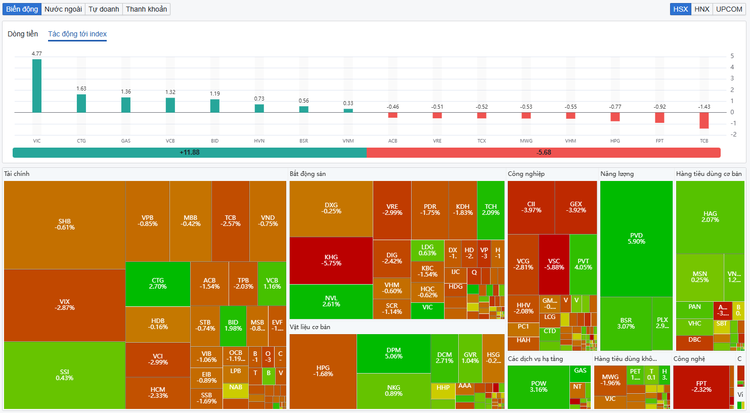 Nhóm bất động sản nhìn chung giảm điểm. VHM lùi 0,6%, VRE mất gần 3%, CEO giảm 2,39%. Riêng VIC đi ngược xu hướng khi tăng mạnh 2,74%, đóng góp đáng kể vào việc giữ nhịp chỉ số.