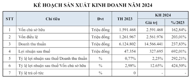 Năm nay, công ty đề ra kế hoạch kinh doanh tham vọng với doanh thu 14.566 tỷ đồng, gấp 2,4 lần và lãi sau thuế 328 tỷ đồng, gấp 6,9 lần thực hiện 2023. Riêng quý đầu năm, công ty báo doanh thu giảm 88% xuống 476 tỷ đồng và lỗ ròng 24 tỷ đồng.