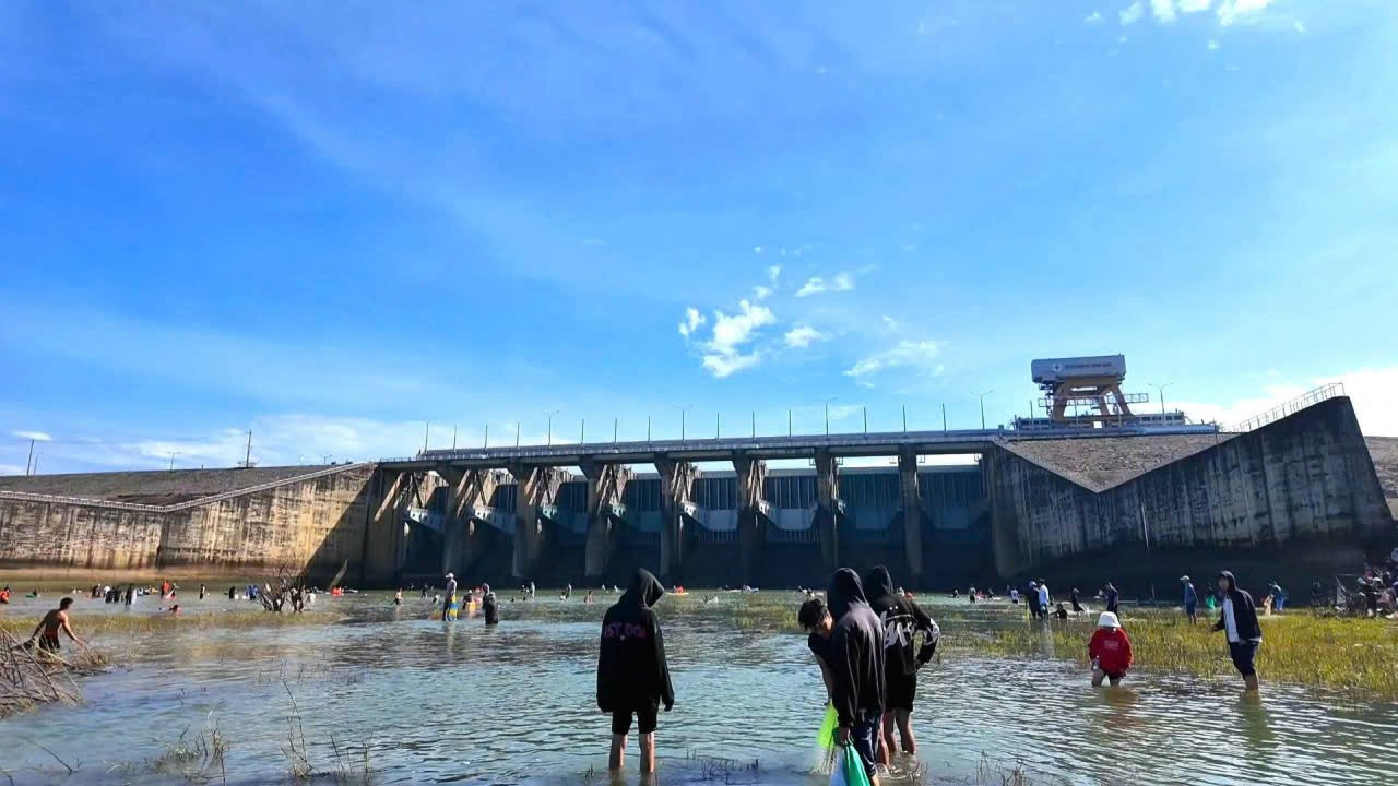 Nhiều người tập trung bắt cá sau khi Nhà máy thủy điện ngưng xả tràn